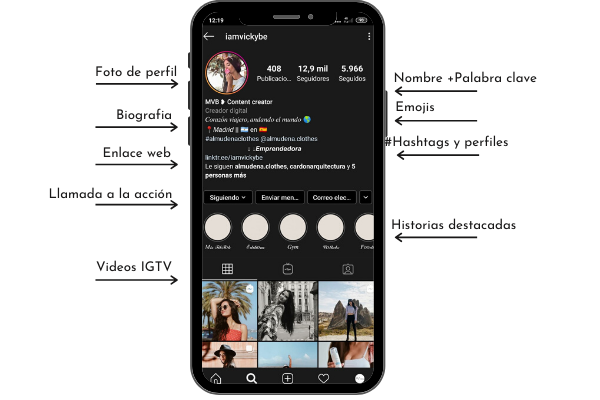 - Nombre de perfil y palabra clave: Junto con el nombre de tu usuario coloca una palabra clave sobre ti o tu negocio, ya que cuando alguien busque esa palabra aparecerá tu perfil. Por ej., Victoria | Marketing (Quienes busquen la palabra marketing, se encontrarán con el perfil de Victoria). Si es una marca, pon a que se dedica aunque parezca obvio.